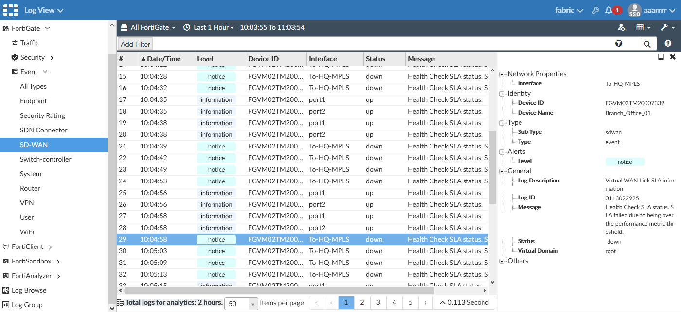 date="2021-04-15" time="10:05:03" id=6951431639754866704 bid=52514 dvid=1046 itime=1618506303 euid=3 epid=3 dsteuid=3 dstepid=3 logver=700000066 logid="0113022925" type="event" subtype="sdwan" level="notice" msg="Health Check SLA status. SLA failed due to being over the performance metric threshold." logdesc="SDWAN SLA information" status="down" interface="To-HQ-MPLS" eventtime=1618506304085863643 tz="-0700" eventtype="SLA" jitter="0.000" inbandwidthavailable="10.00Gbps" outbandwidthavailable="10.00Gbps" bibandwidthavailable="20.00Gbps" packetloss="100.000%" latency="0.000" slamap="0x0" healthcheck="BusinessCritical_CloudApps" slatargetid=1 metric="packetloss" outbandwidthused="6kbps" inbandwidthused="3kbps" bibandwidthused="9kbps" devid="FGVM02TM20000000" vd="root" devname="Branch_Office_02" csf="fabric"
