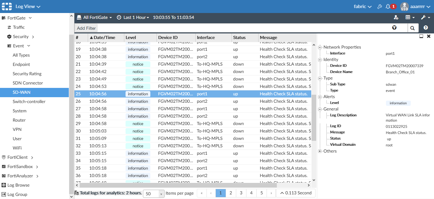 Performance SLA results related to interface selection, session failover, and other information, can be logged. These logs can then be used for long-term monitoring of traffic issues at remote sites, and for reports and views in FortiAnalyzer.